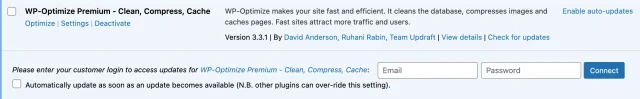 You’ll be prompted to enter your WP-Optimize credentials to link your site to licences. This will verify your purchase and enable the plugin to receive automatic updates. Enter the required details and click Connect.