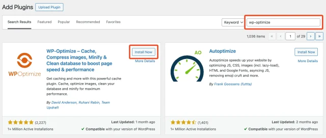 4. Look for the WP-Optimize plugin and click Install Now.